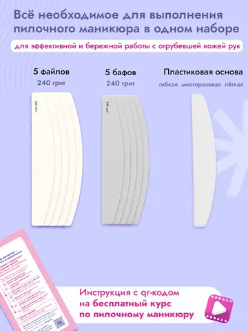 Состав набора: пластиковая основа, 5 файлов 240 грит, 5 бафов 240 грит, инструкция.