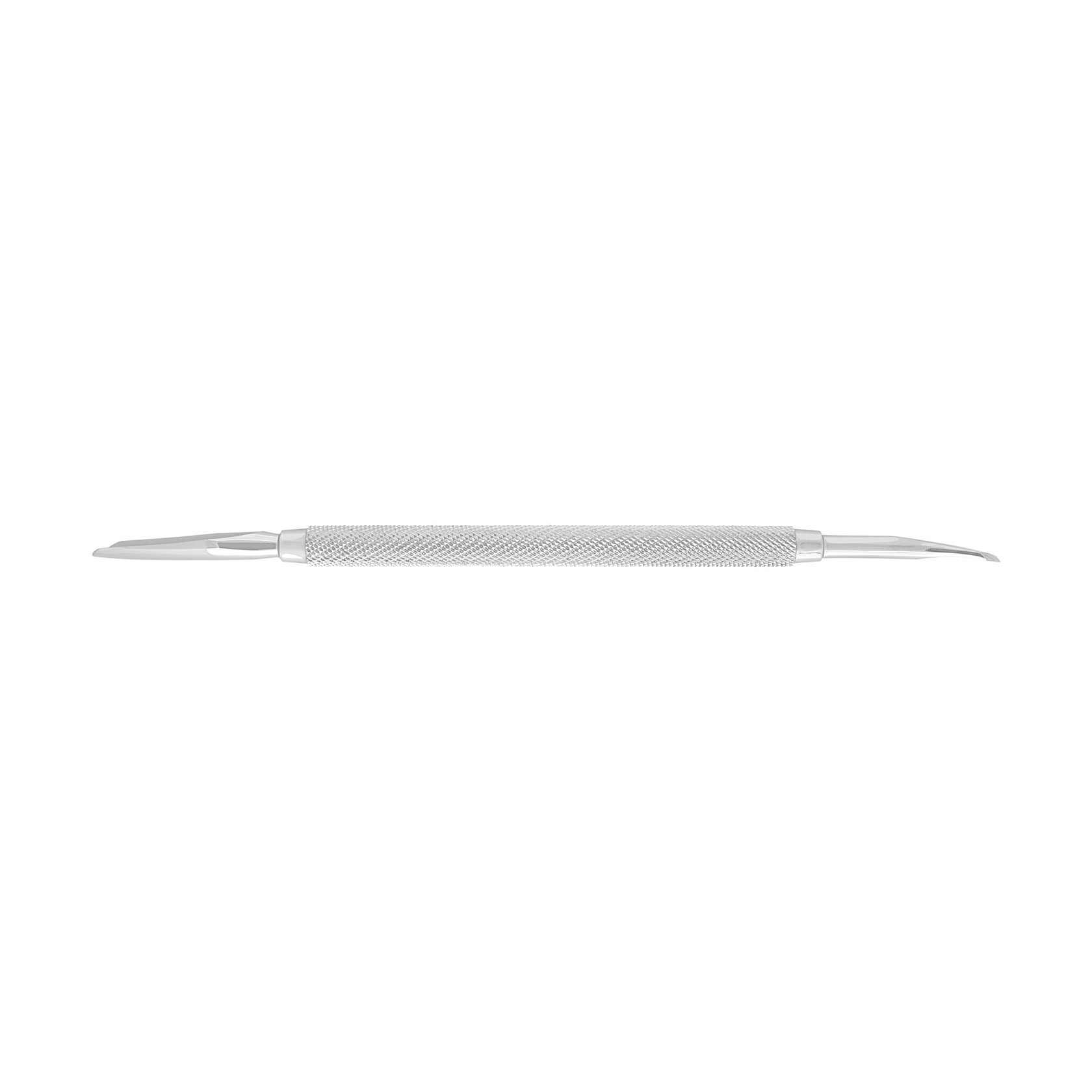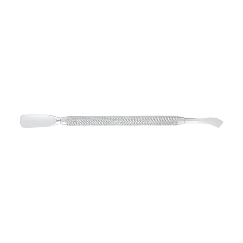 Пушер стандартной длины с лопаткой и топориком. Лопатка предназначена для отодвигания кутикулы с целью дальнейшего удаления ножницами или кусачками. Топорик хорошо подходит для очистки ногтя от птеригия и обработки поверхности у боковых валиков и внутренней стороны свободного края.